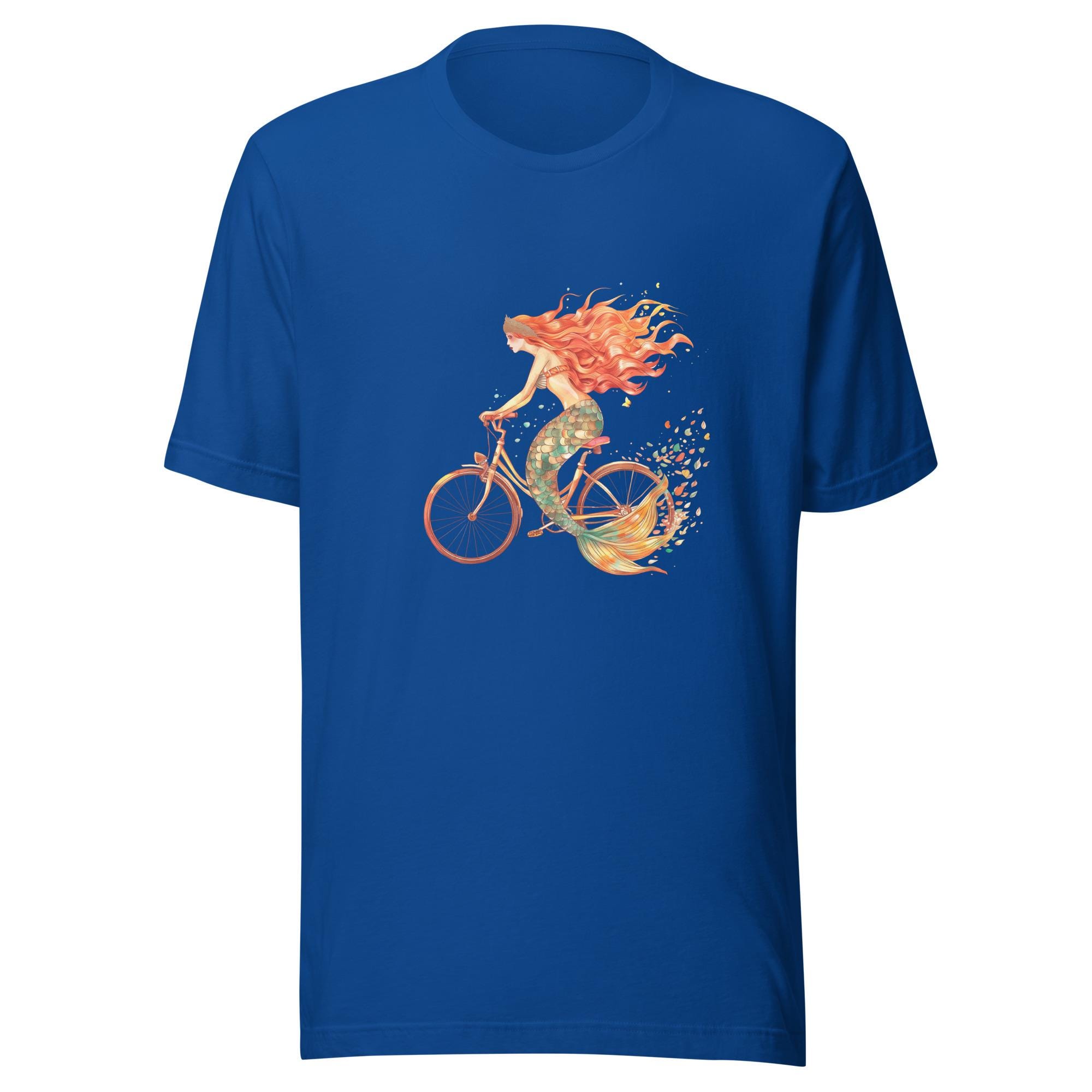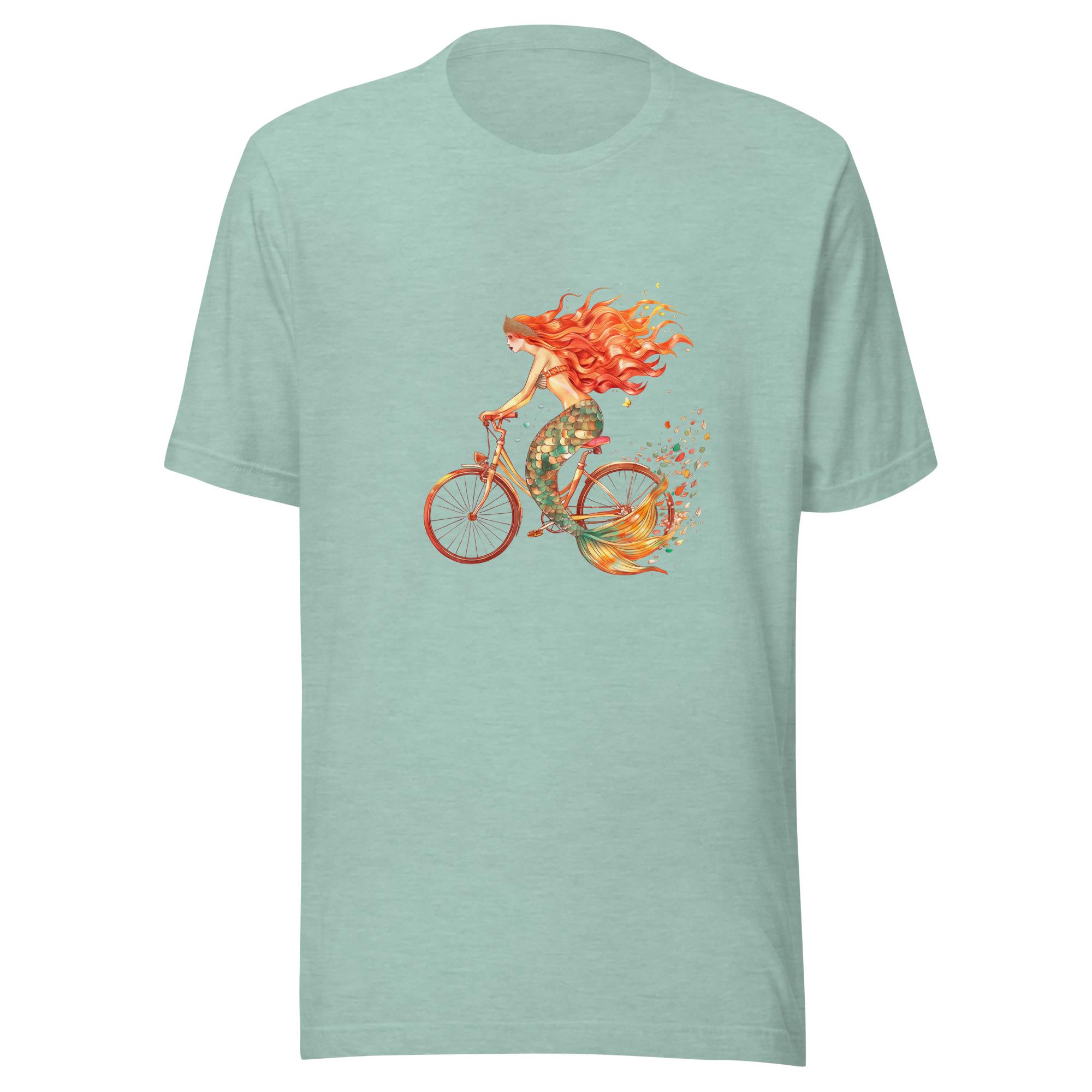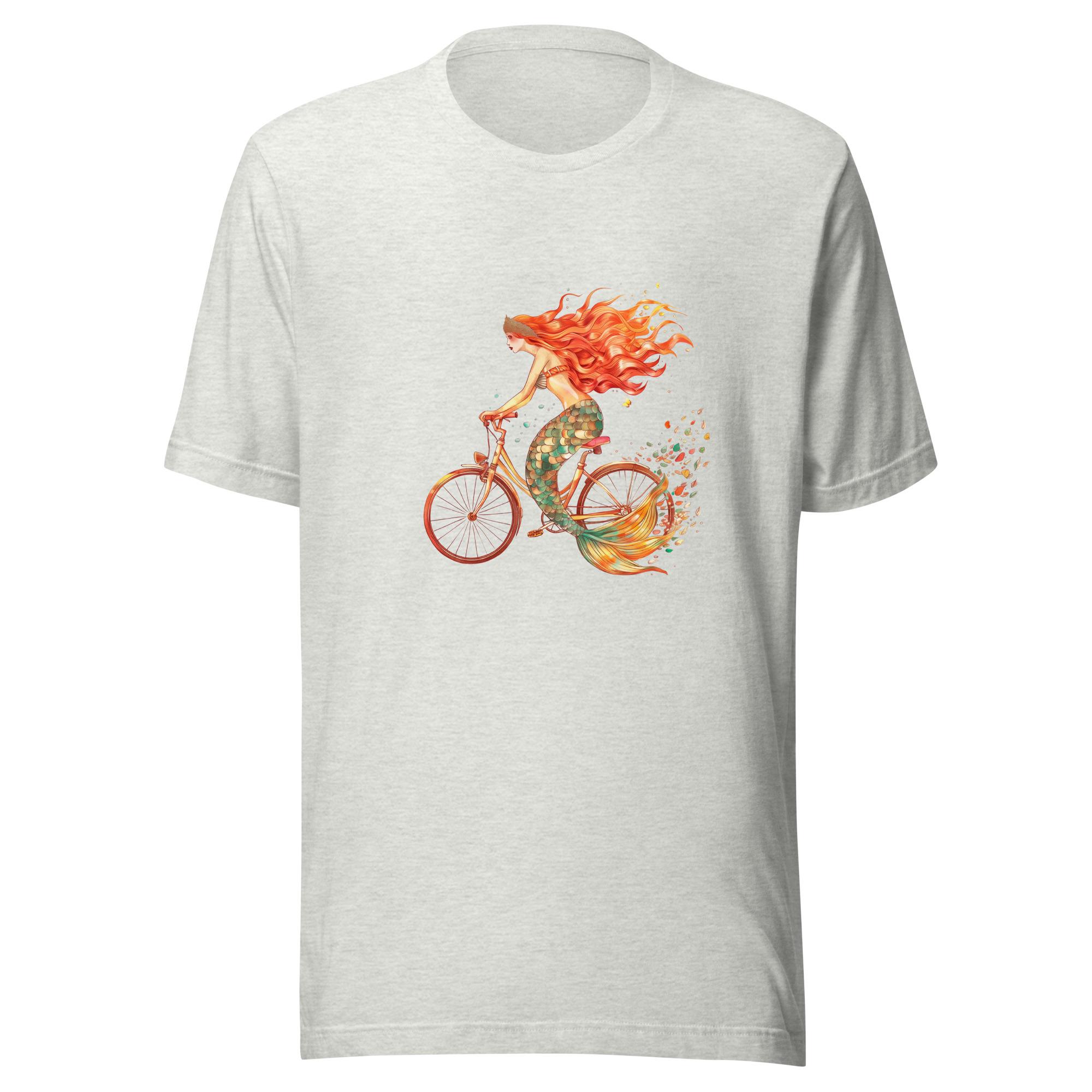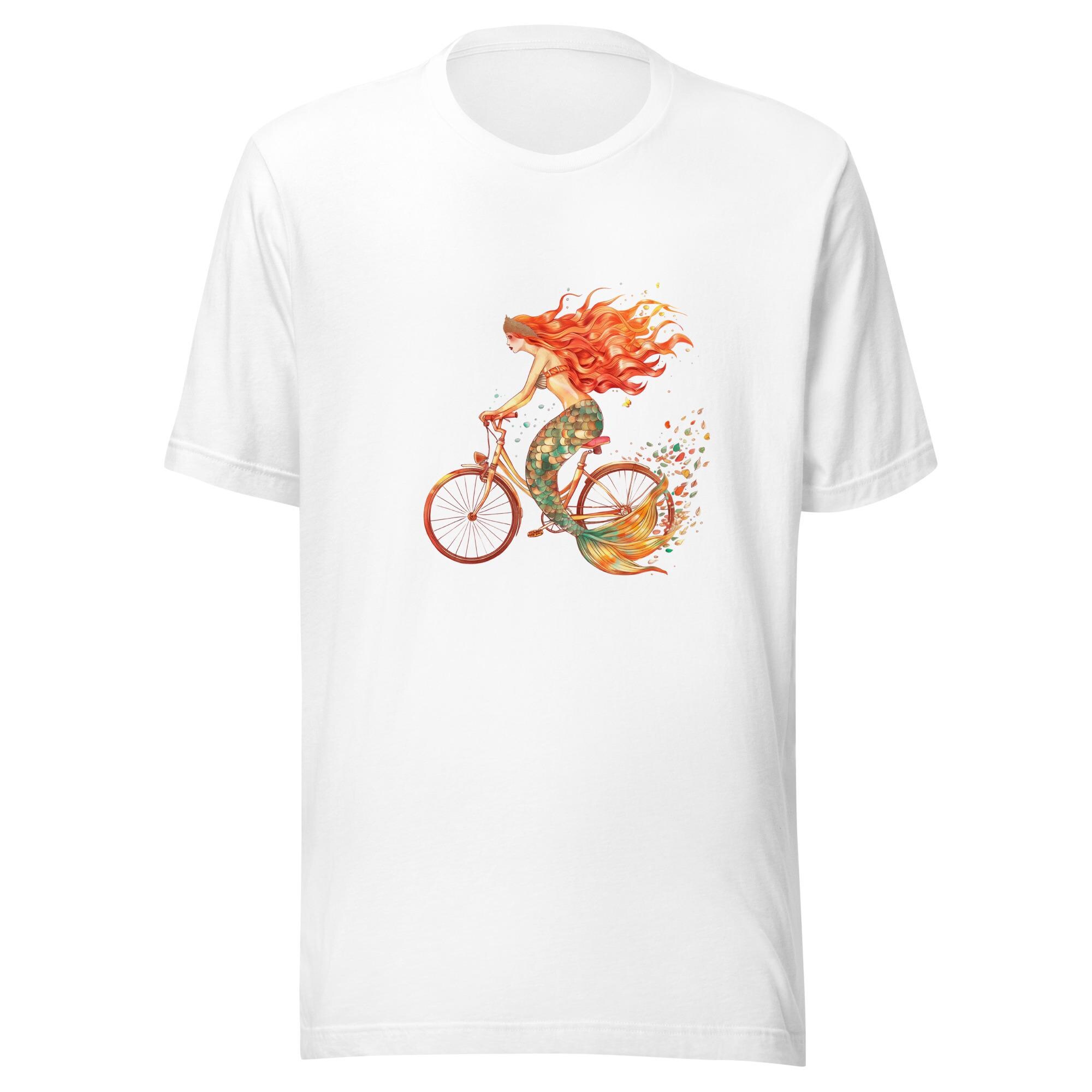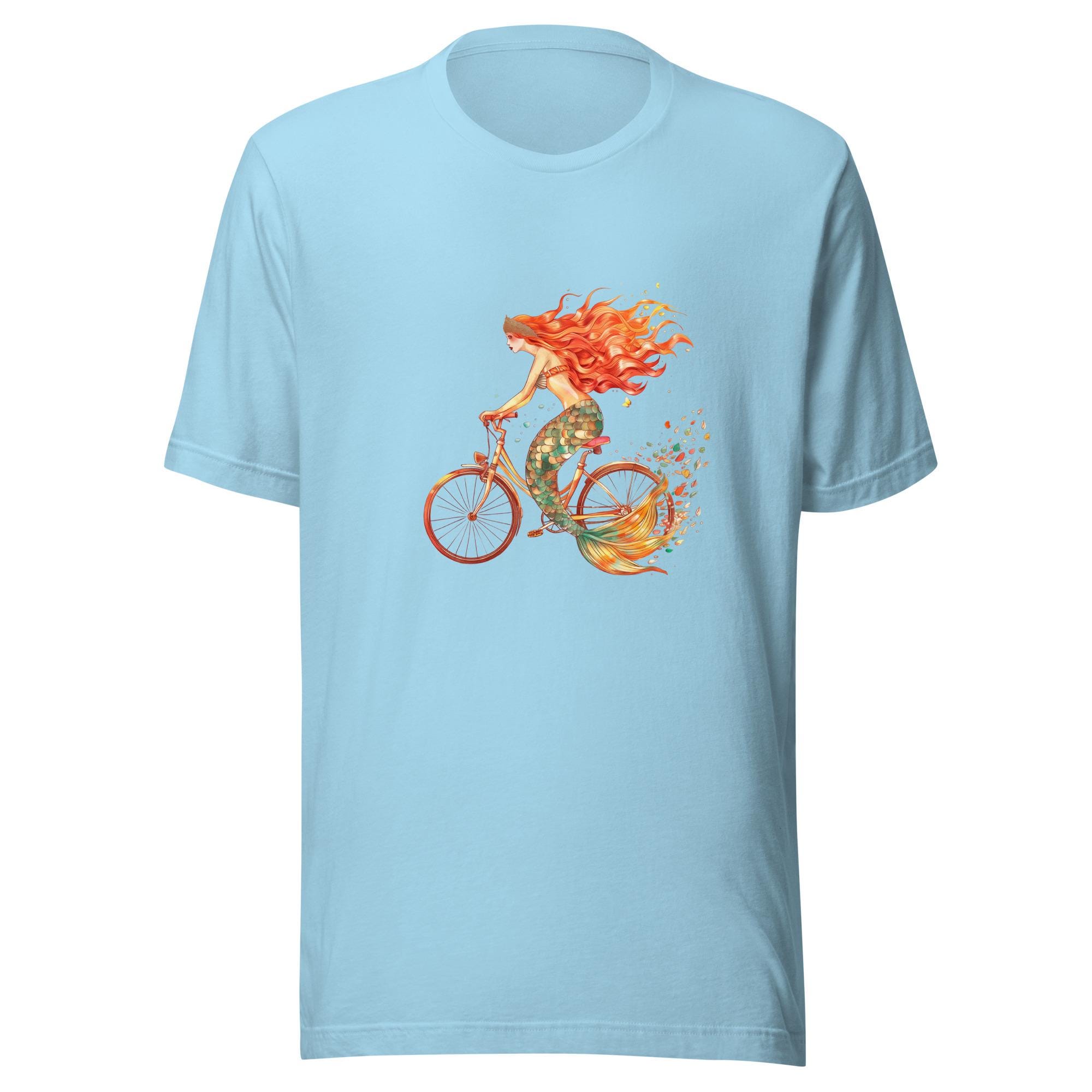 This t-shirt features a vibrant and whimsical design printed on the front. The central image showcases a mermaid riding a bicycle, creating a unique and fantastical scene.