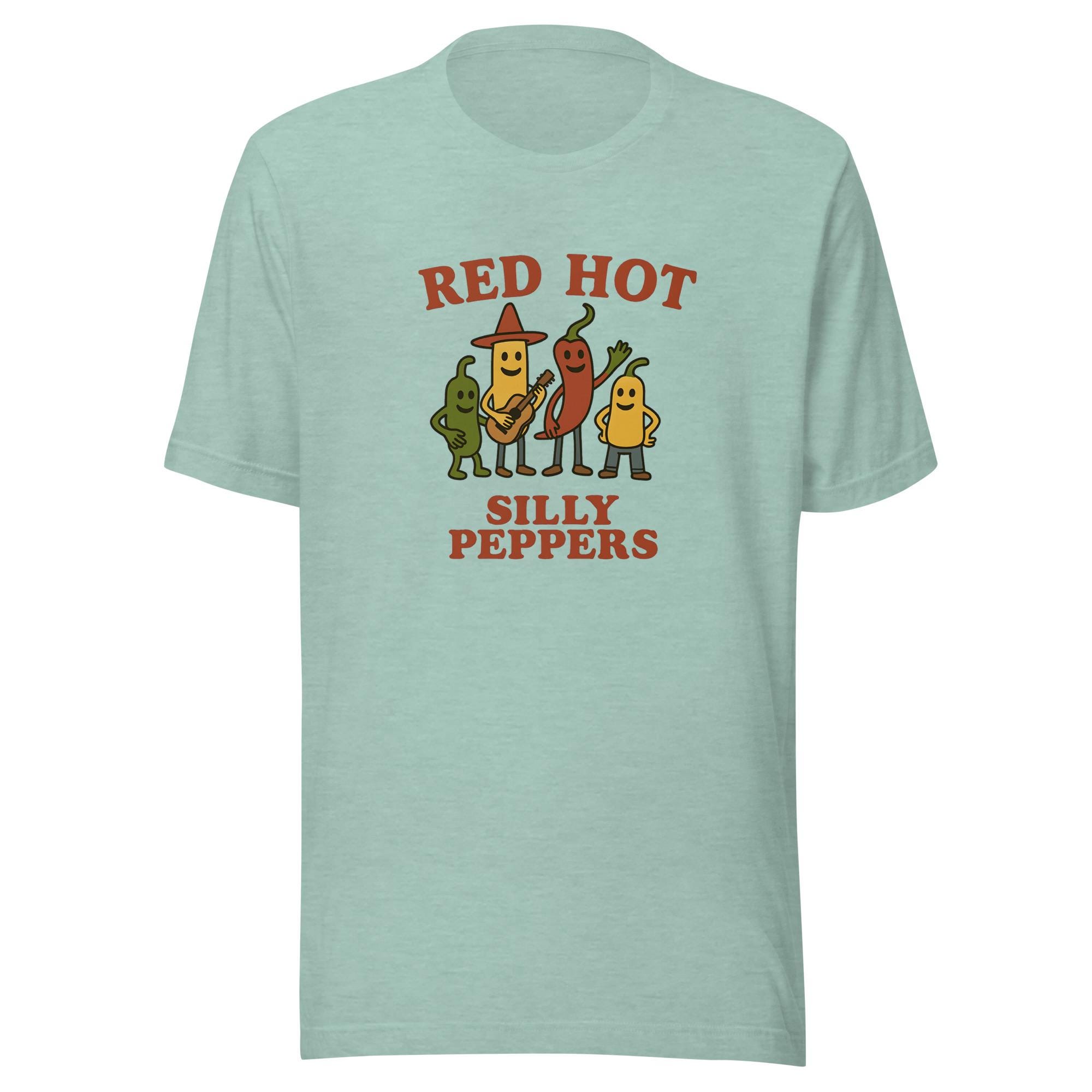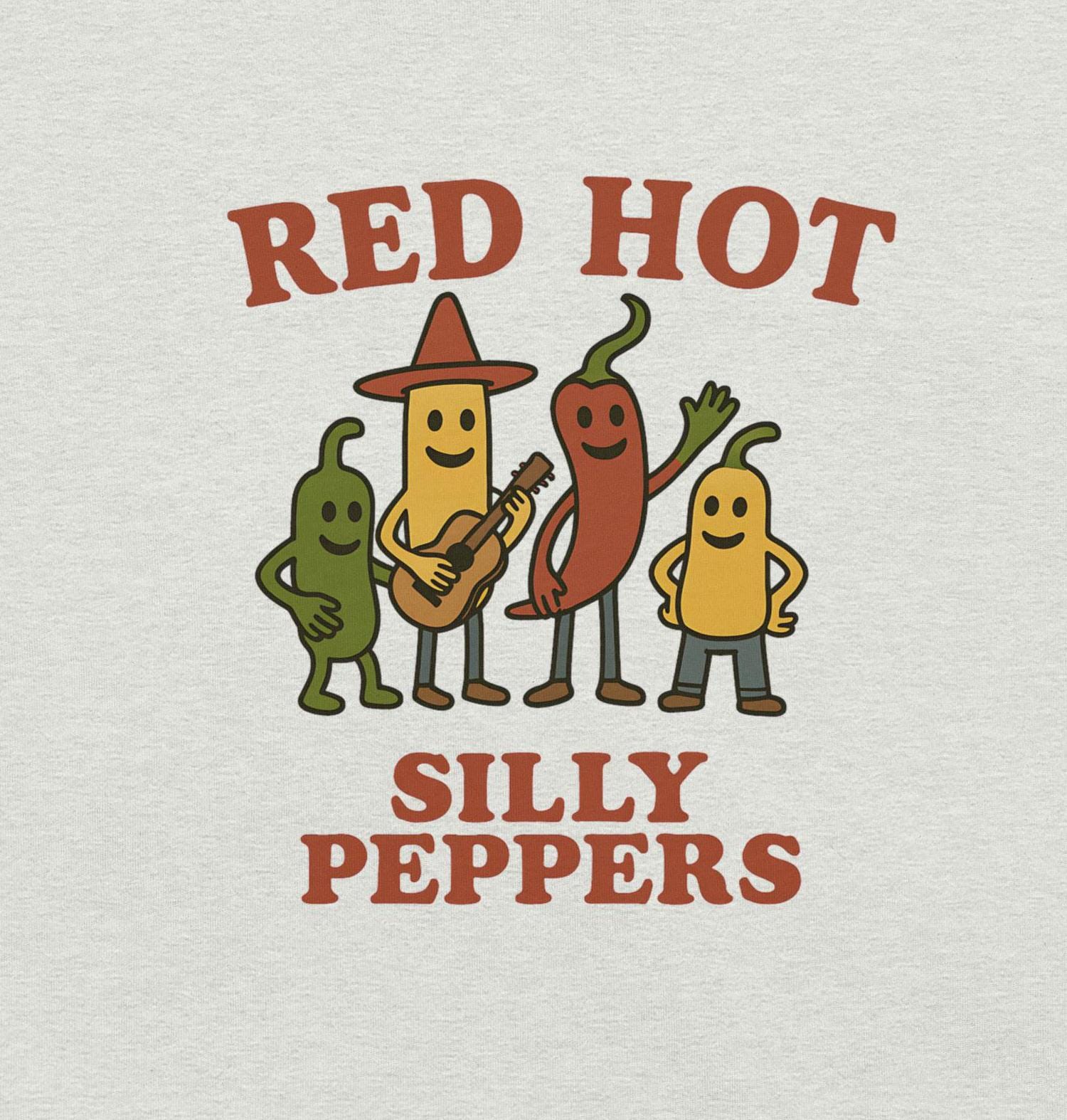 Turn up the heat with this funny peppers t-shirt, featuring a playful parody of a legendary rock band! These silly peppers are bringing the spice and the rhythm, making this hilarious band tee a must-have for music lovers, foodies, and pun lovers alike. Perfect for concerts, casual outings, or just adding some flavor to your wardrobe, this spicy graphic tee is a conversation starter.