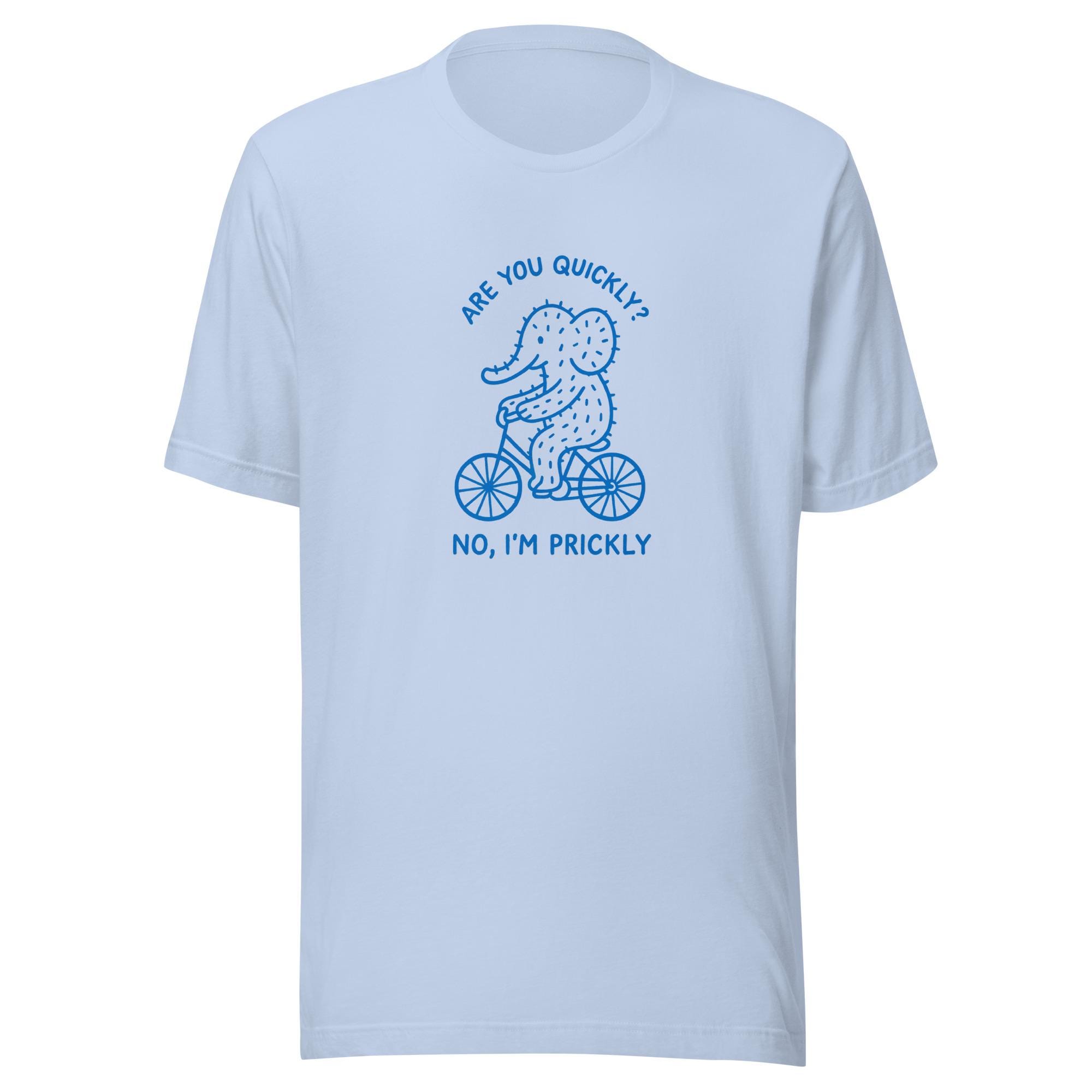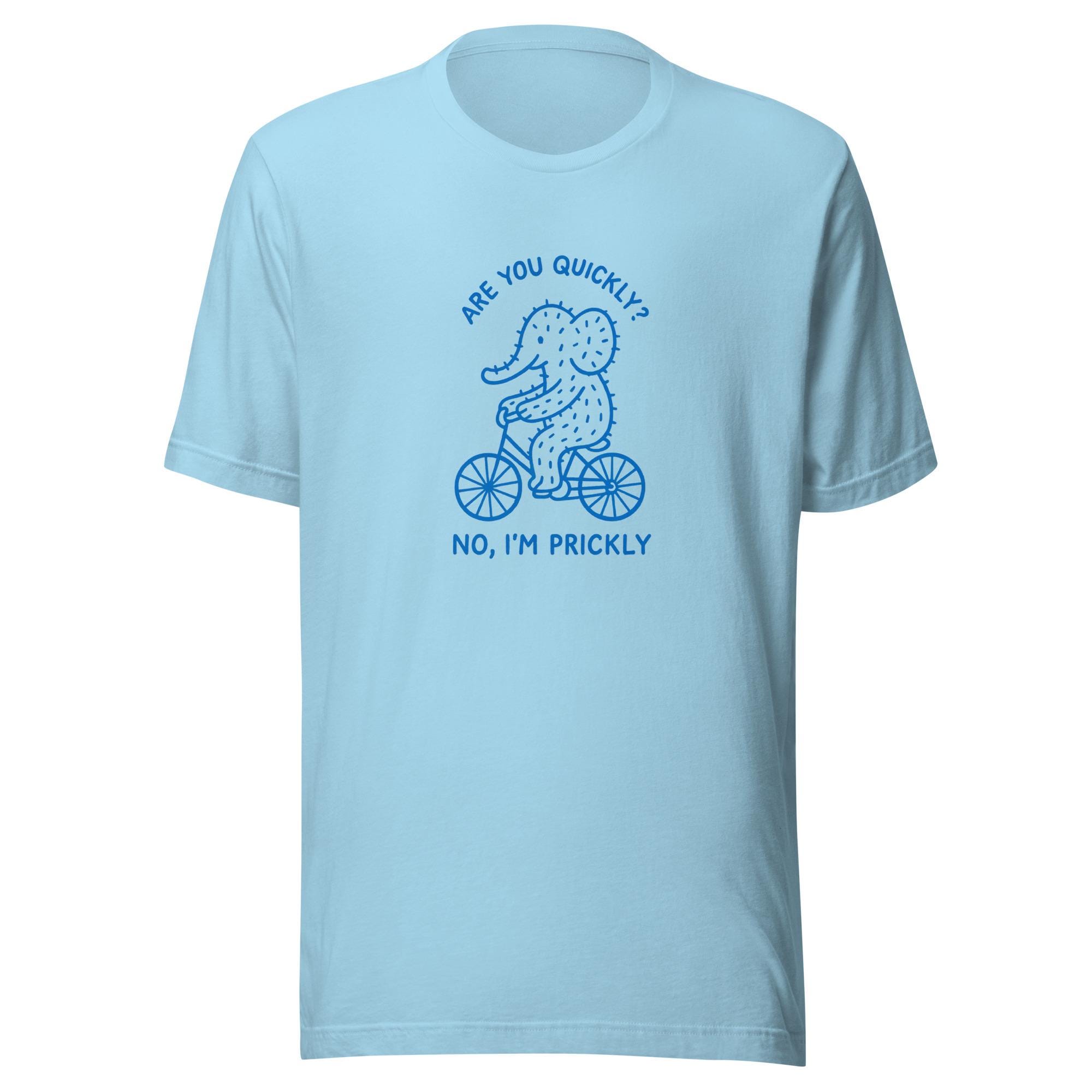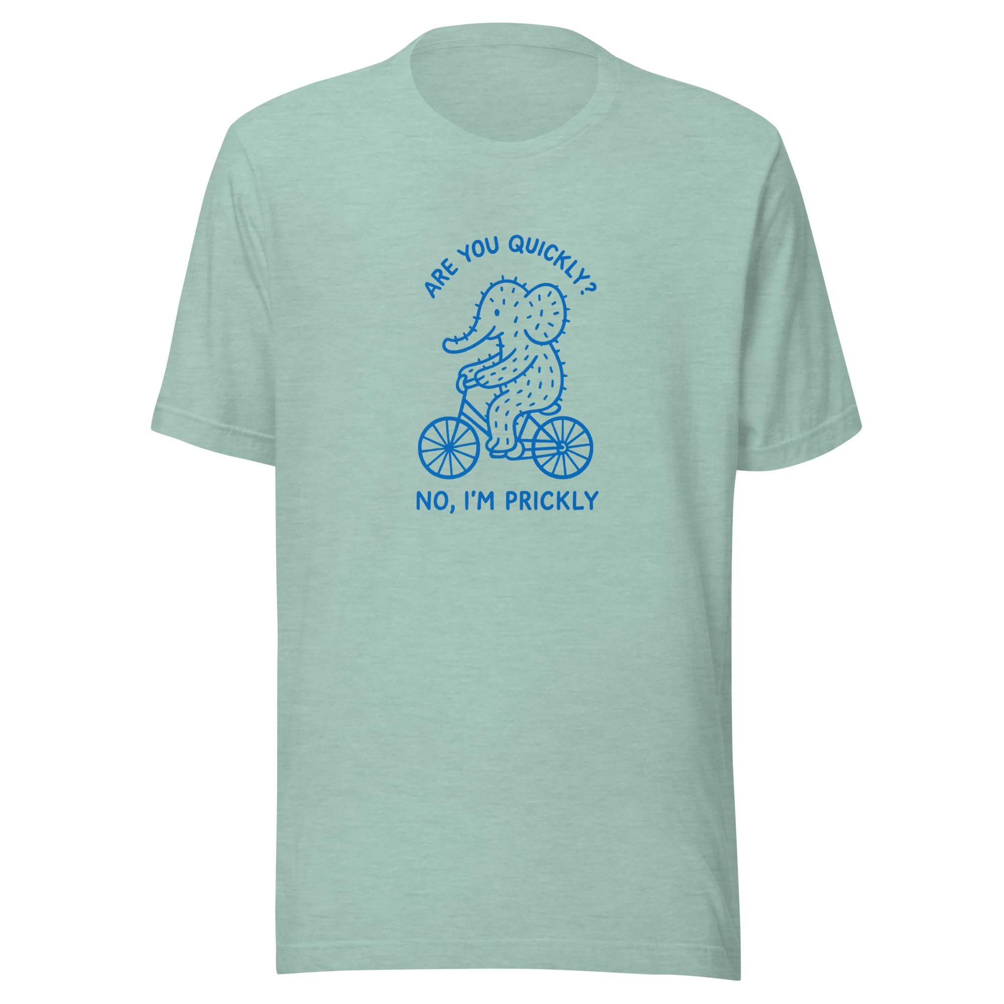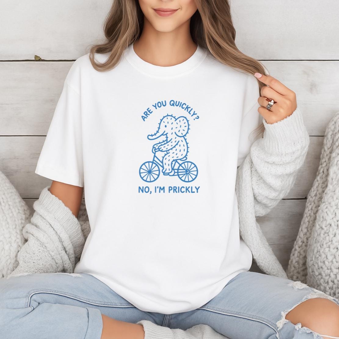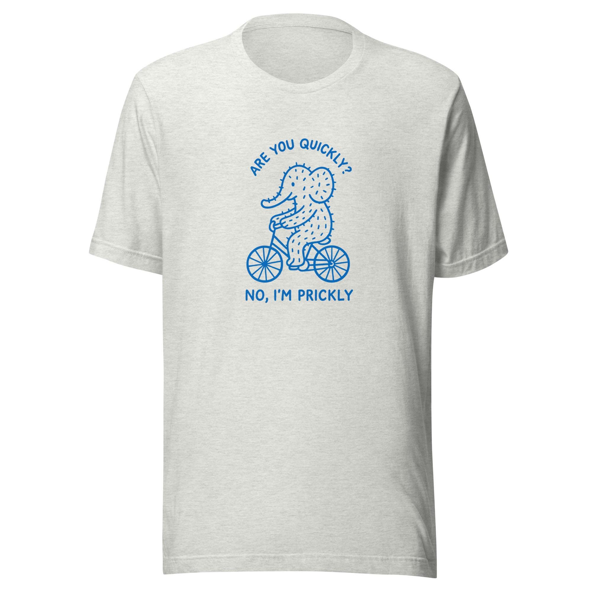 This funny and unique t-shirt features a quirky cactus elephant riding a bicycle with the playful phrase: "Are you quickly? No, I'm prickly." Perfect for lovers of oddball humor, cute animal puns, and whimsical art!