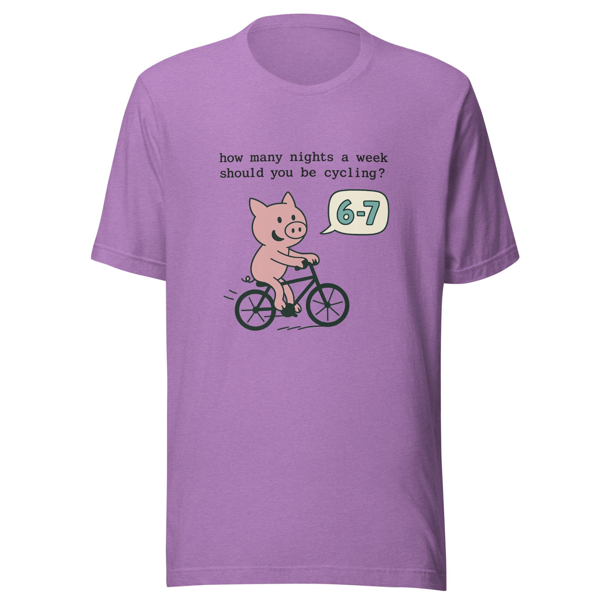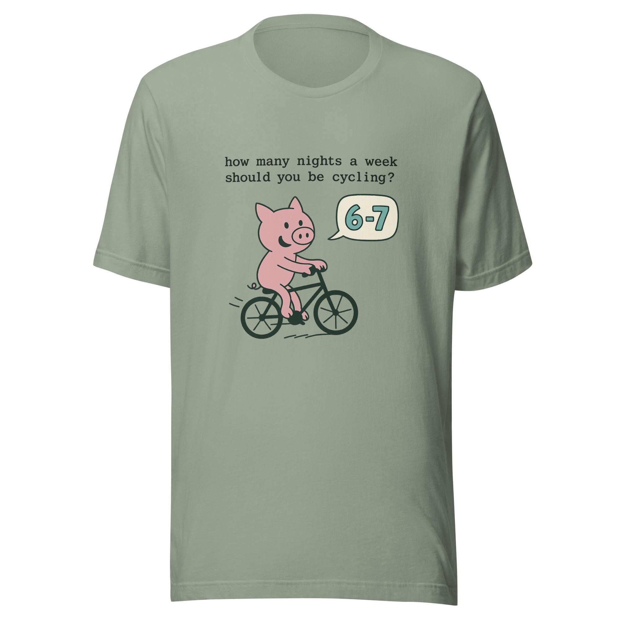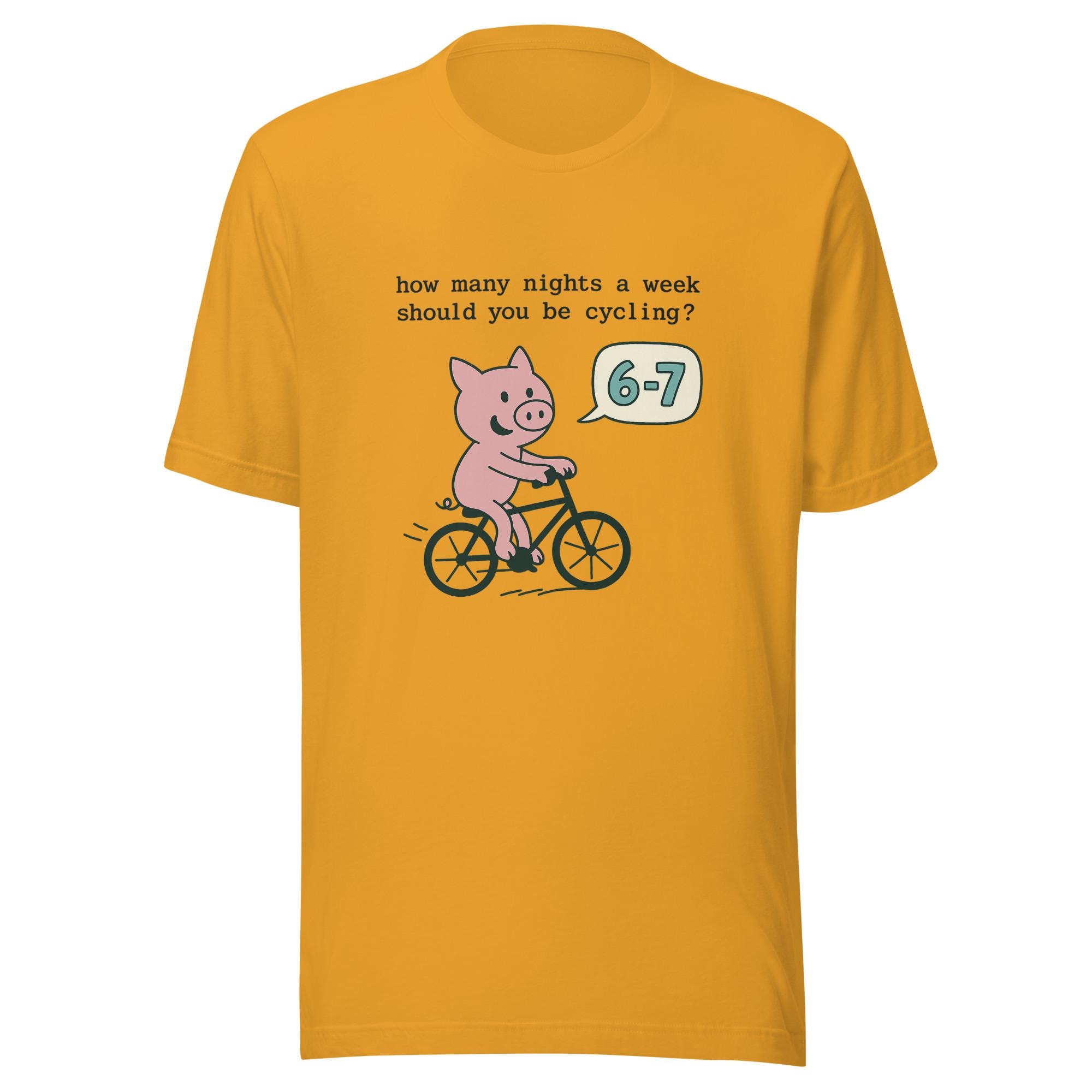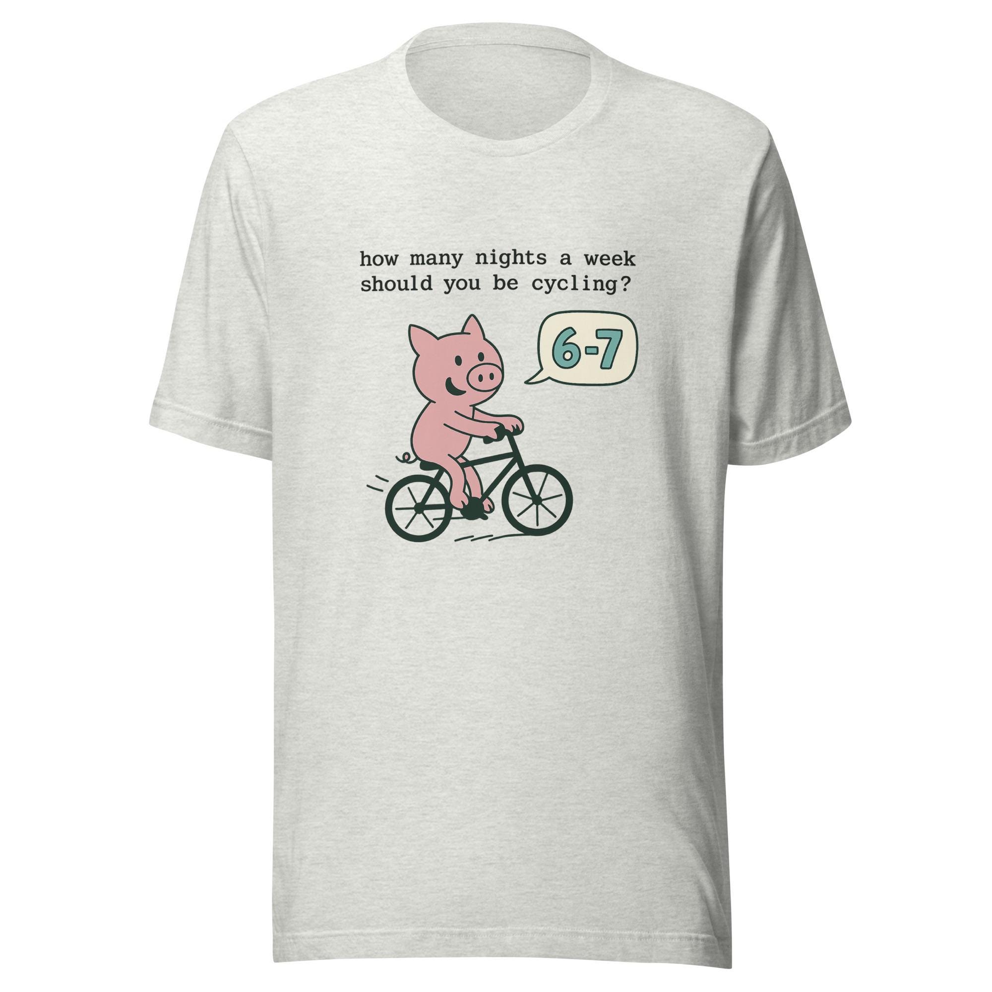 This hilarious and wholesome T-shirt featuring a cheerful cartoon pig riding a bicycle with the iconic phrase “How many nights a week should you be cycling? 6–7,” this design riffs on the trending “67” meme and makes a funny gift for cyclists, or anyone who appreciates quirky tees.