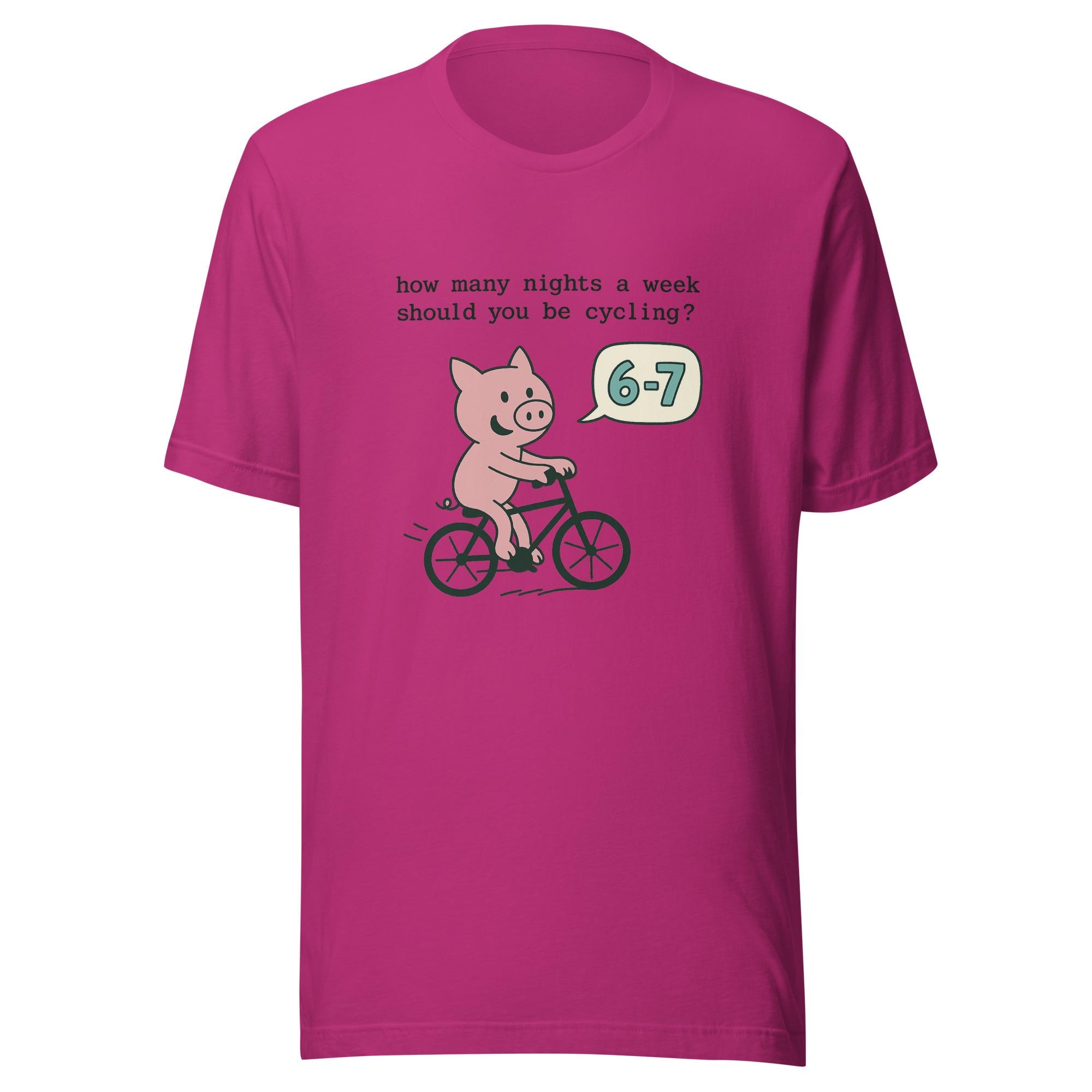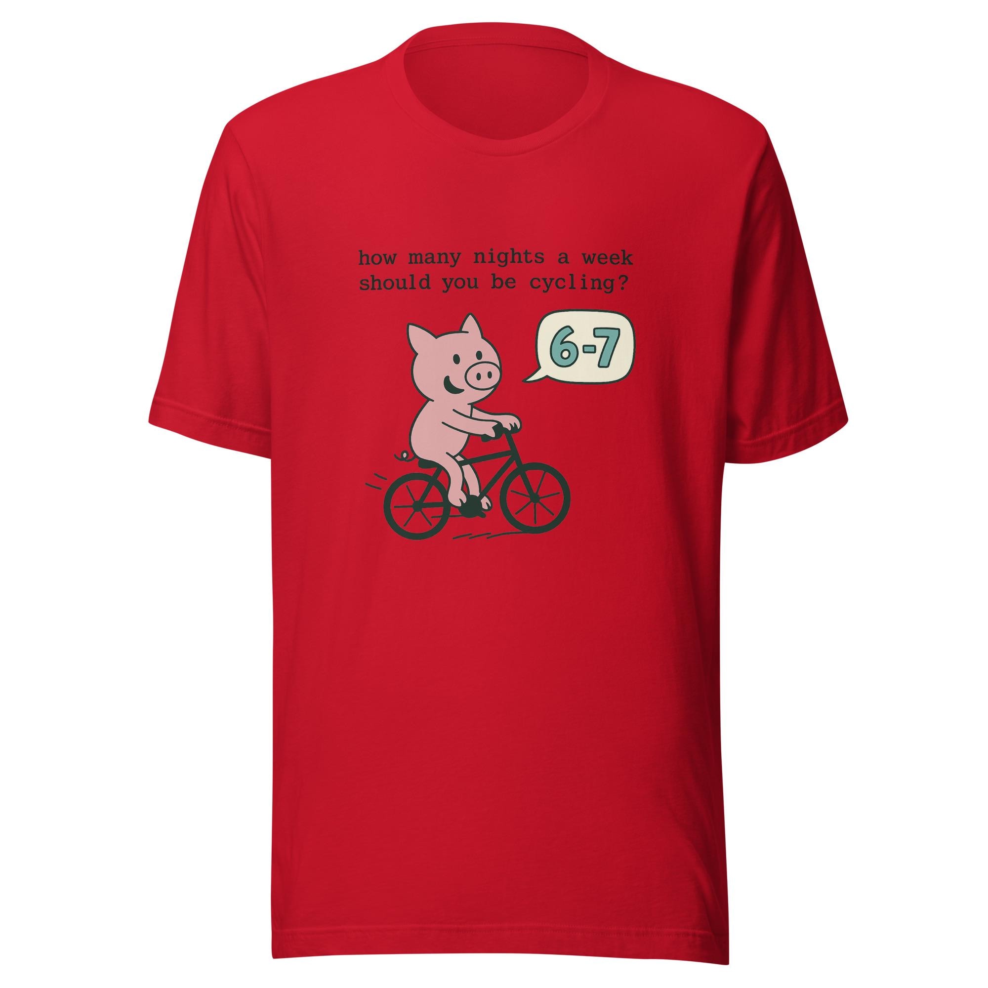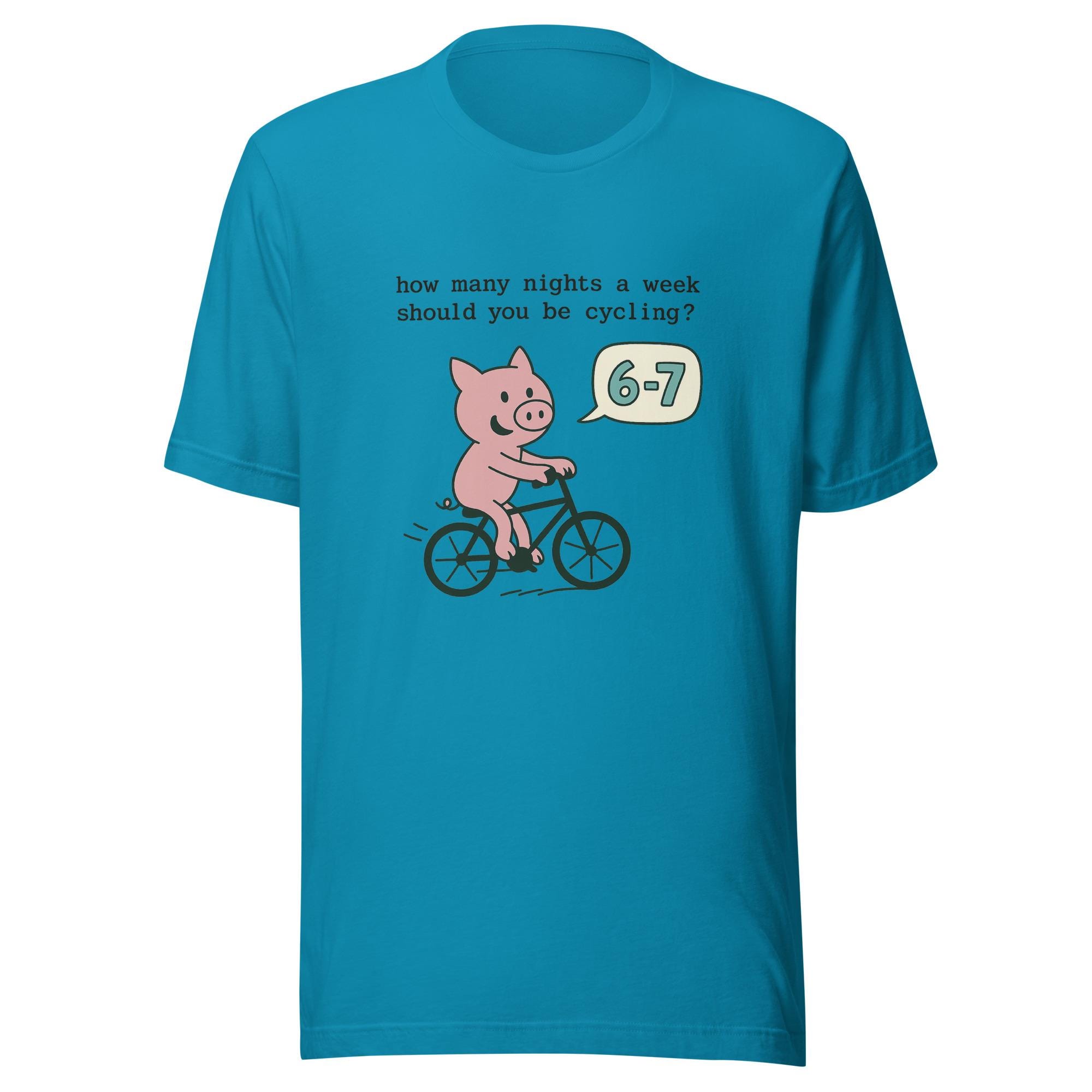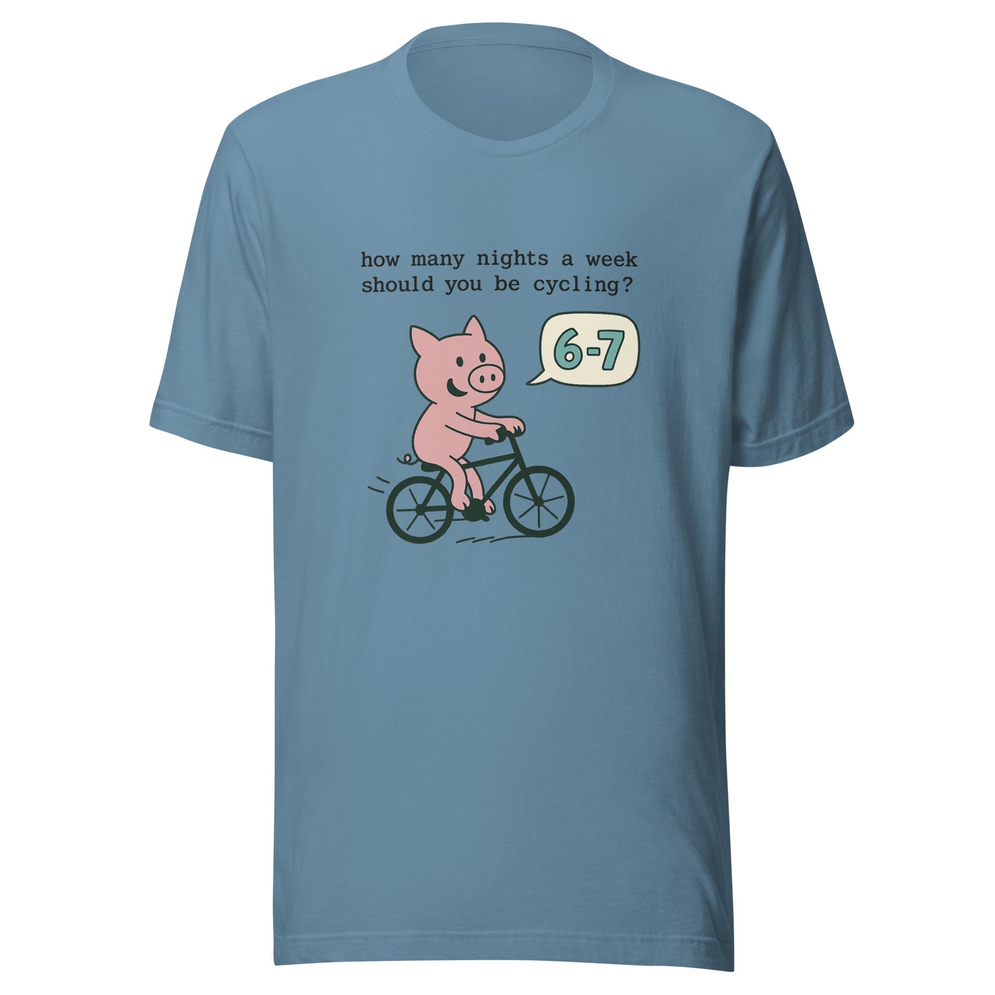 This hilarious and wholesome T-shirt featuring a cheerful cartoon pig riding a bicycle with the iconic phrase “How many nights a week should you be cycling? 6–7,” this design riffs on the trending “67” meme and makes a funny gift for cyclists, or anyone who appreciates quirky tees.